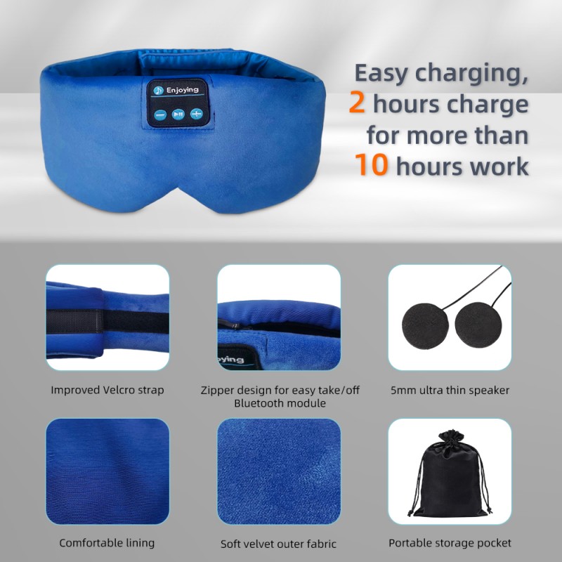 소프트 조정 가능한 정전 실크 블루투스 수면 아이 마스크 수면 헤드 푸스 파란색 무선 블루투스 마스크에 사용되는 직물은 매우 부드럽고 편안하여 부드러운 포옹 느낌을줍니다. 그것은 당신의 얼굴에 완벽하게 맞고 많은 외부 빛을 차단하는 데 도움이되며, 밤에는 빛을 좋아하지 않거나 불면증이있는 사람들/사이드 슬리퍼에게 이상적인 솔루션입니다.